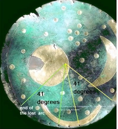 Wenn das Boot auf der Himmelsscheibe wirklich als Symbol für die Tagundnachtgleiche gedacht war, dann sollte dies aus einer entsprechenden Maßzahl auf der Himmels-Scheibe auch hervorgehen. Und tatsächlich ist dies auch der Fall. Eine solche Maßzahl ist sogar zweimal vorhanden. Die Scheibe zeigt einen Winkel von 41 Grad zwischen den Enden eines jeden der beiden Bögen an der Seite und dem ersten Punkt oder Loch auf jeder Seite des Bootes, die in Kontakt mit dem Boden des Bootes sind. Insgesamt sind drei Löcher in Kontakt mit dem Boden des Bootes. Um die beiden äußeren geht es hier. (Es gibt insgesamt 39 oder 40 Punkte auf dem Rand der Scheibe)