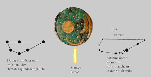 Die Sonnen-Barke auf der Scheibe von Nebra im Vergleich mit dem Altchines. Sternbild Boot Tianchuan in der Milchstraße,